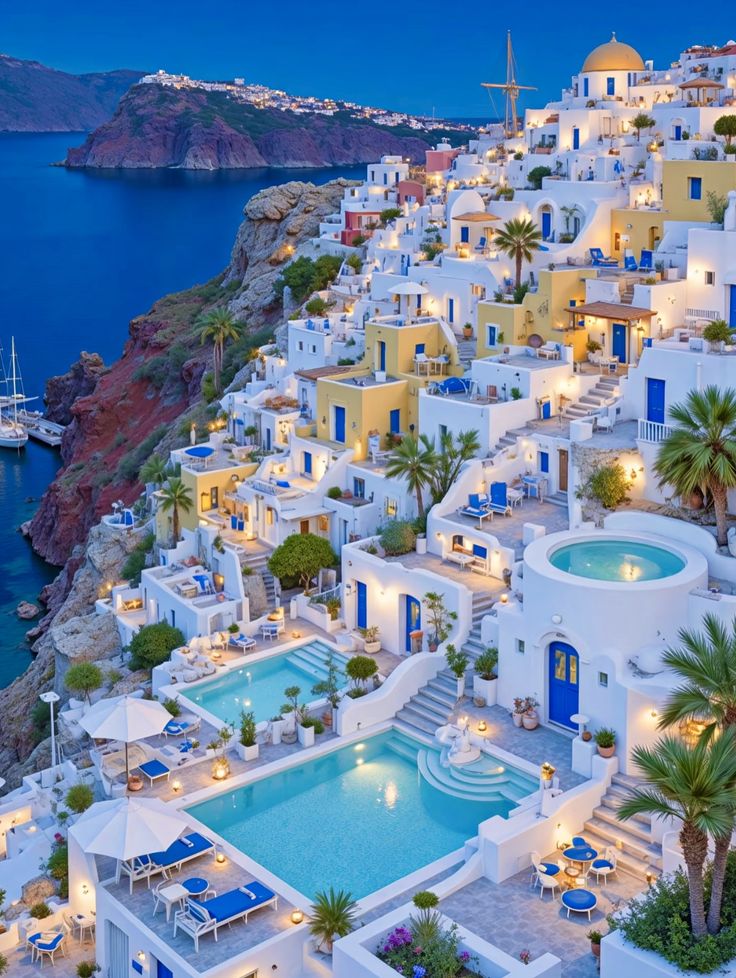 Santorini dikenal dengan rumah-rumah bercat putih yang berdiri di tebing tinggi, berpadu dengan kubah biru yang menghadap langsung ke Laut Aegea. Pemandangan ini tercipta dari aktivitas vulkanik ribuan tahun lalu yang membentuk tebing curam dan garis pantai yang dramatis. Saat matahari terbenam, langit Santorini berubah warna menjadi jingga keemasan, menciptakan suasana romantis yang memukau para pengunjung.