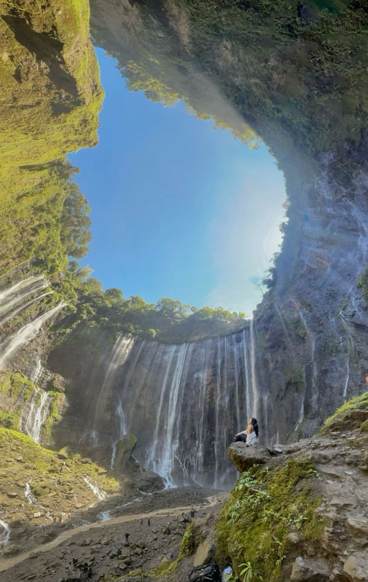 Dari atas, Anda bisa menikmati panorama luas dengan latar tebing hijau yang melingkar. Namun, pengalaman tidak berhenti di sana. Banyak pengunjung memilih turun ke dasar untuk merasakan suasana yang lebih dekat dengan alam.